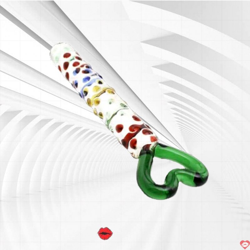 Đặc điểm: Hoa văn nổi nhiều màu xung quanh thân dương vật thủy tinh siêu thị , tay cầm hình trái tim